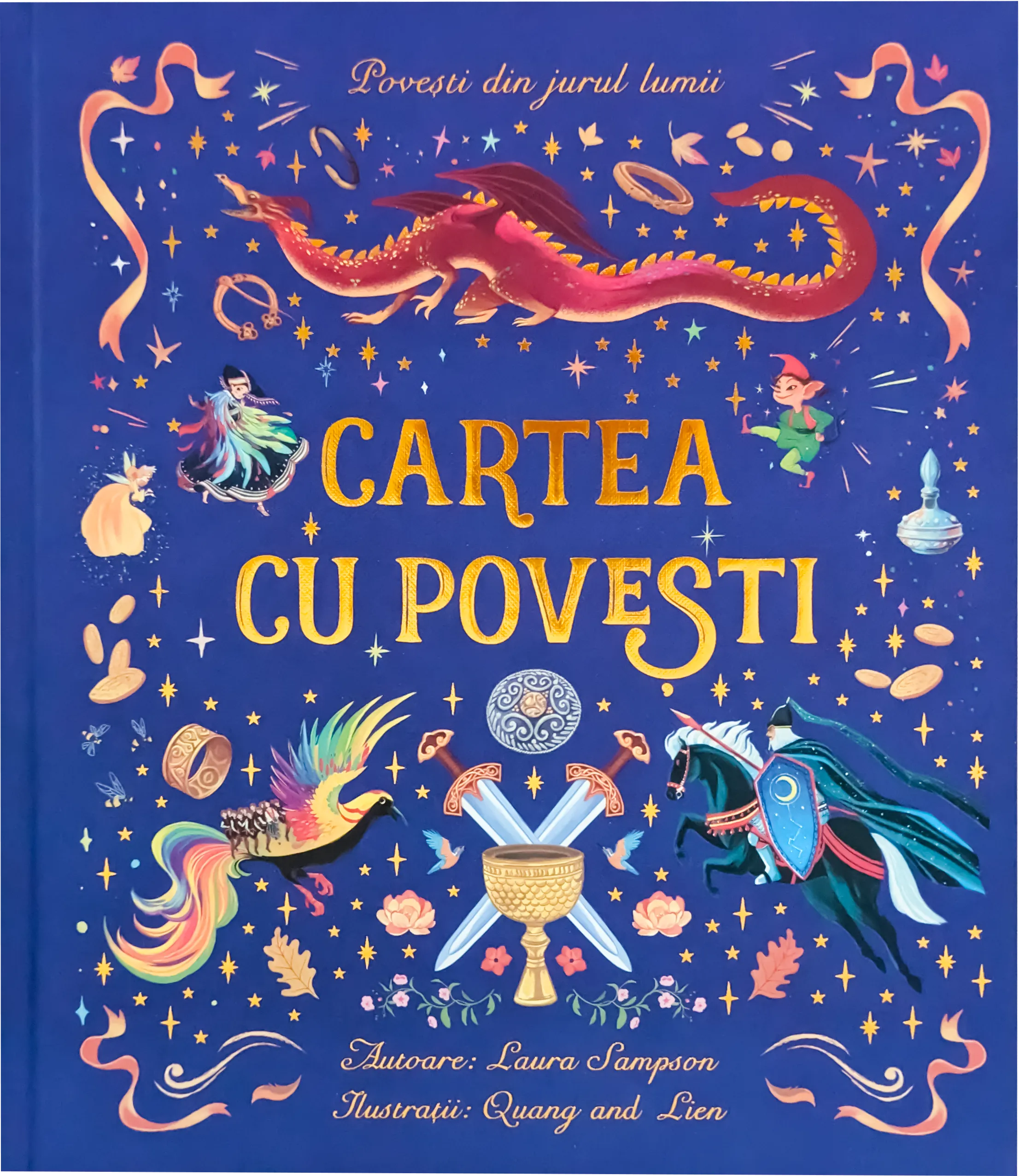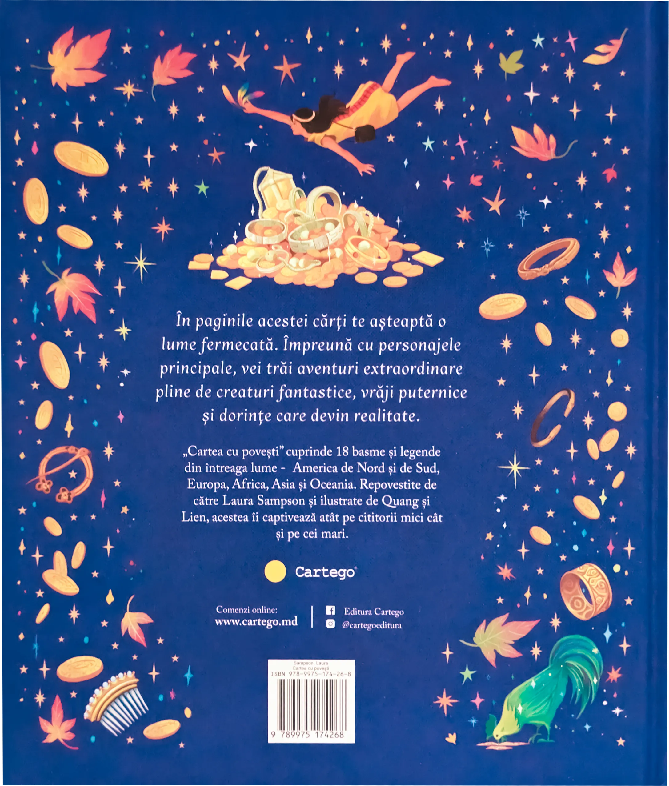 „Cartea cu povești” cuprinde 18 basme și legende din întreaga lume – America de Nord și de Sud, Europa, Africa, Asia și Oceania. Repovestite de către Laura Sampson și ilustrate de Quang și Lien, acestea îi captivează atât pe cititorii mici cât și pe cei mari.n nÎn paginile acestei cărți te așteaptă o lume fermecată. Împreună cu personajele principale, vei trăi aventuri extraordinare pline de creaturi fantastice, vrăji puternice și dorințe care devin realitate.
