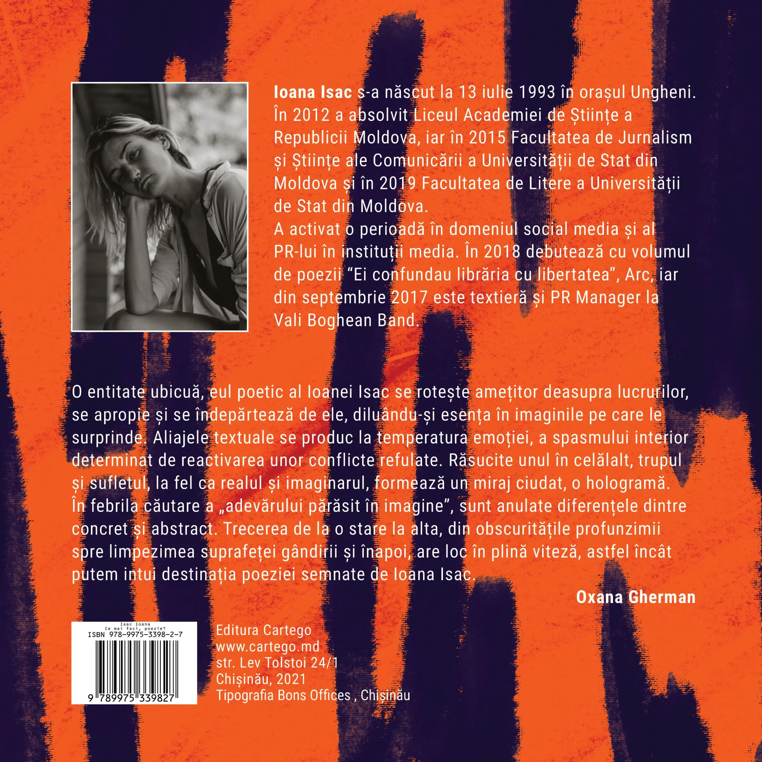 O entitate ubicuă, eul poetic al Ioanei Isac se rotește amețitor deasupra lucrurilor, se apropie și se îndepărtează de ele, diluându-și esența în imaginile pe care le surprinde. Aliajele textuale se produc la temperatura emoției, a spasmului interior determinat de reactivarea unor conflicte refulate. Răsucite unul în celălalt, trupul și sufletul, la fel ca realul și imaginarul, formează un miraj ciudat, o hologramă. În febrila căutare a „adevărului părăsit în imagine”, sunt anulate diferențele dintre concret și abstract. Trecerea de la o stare la alta, din obscuritățile profunzimii spre limpezimea suprafeței gândirii și înapoi, are loc în plină viteză, astfel încât putem intui destinația poeziei semnate de Ioana Isac. n– Oxana Gherman