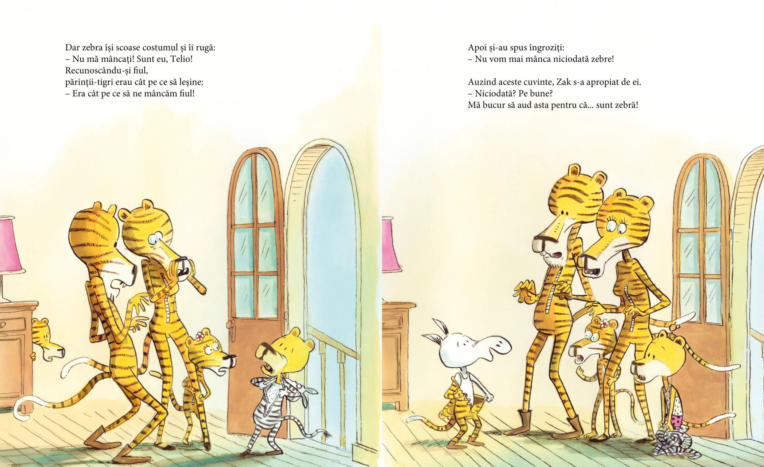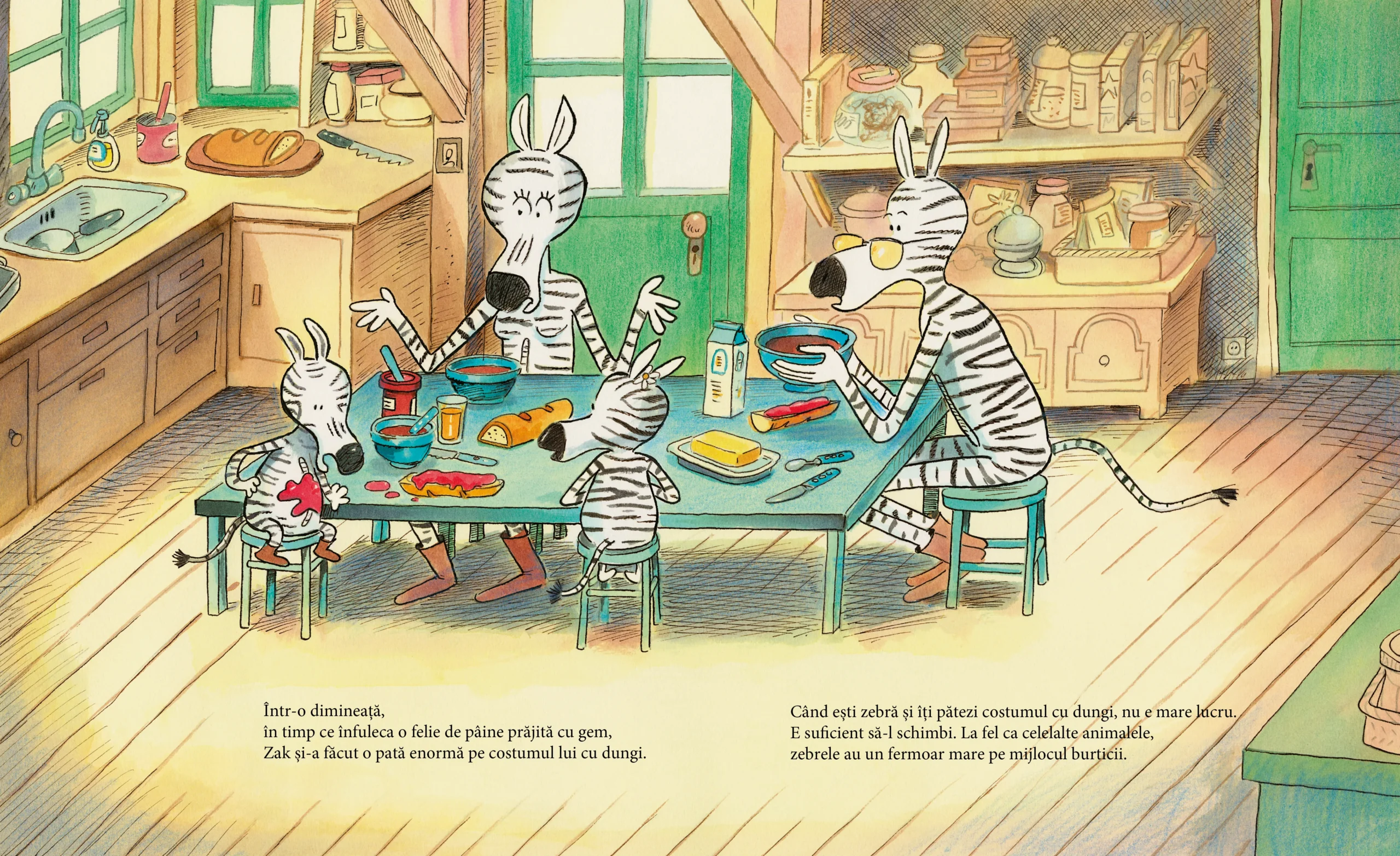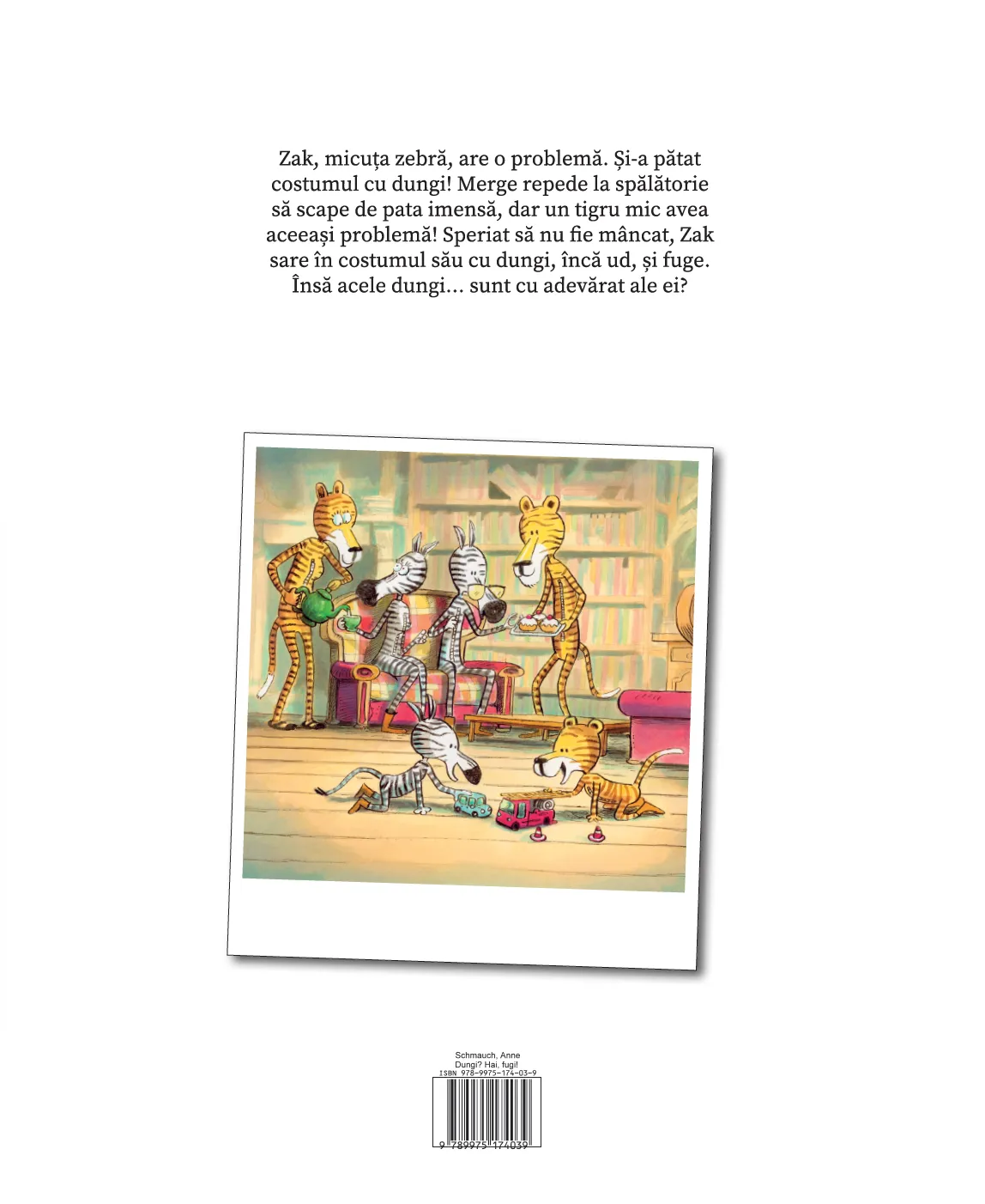 Zak, micuța zebră, are o problemă. Și-a pătat costumul cu dungi! Merge repede la spălătorie, să scape de pata imensă, dar un tigru mic avea aceeași problemă! Speriat să nu fie mâncat, Zak sare în costumul său cu dungi, încă ud, și fuge. Însă acele dungi… sunt cu adevărat ale ei?