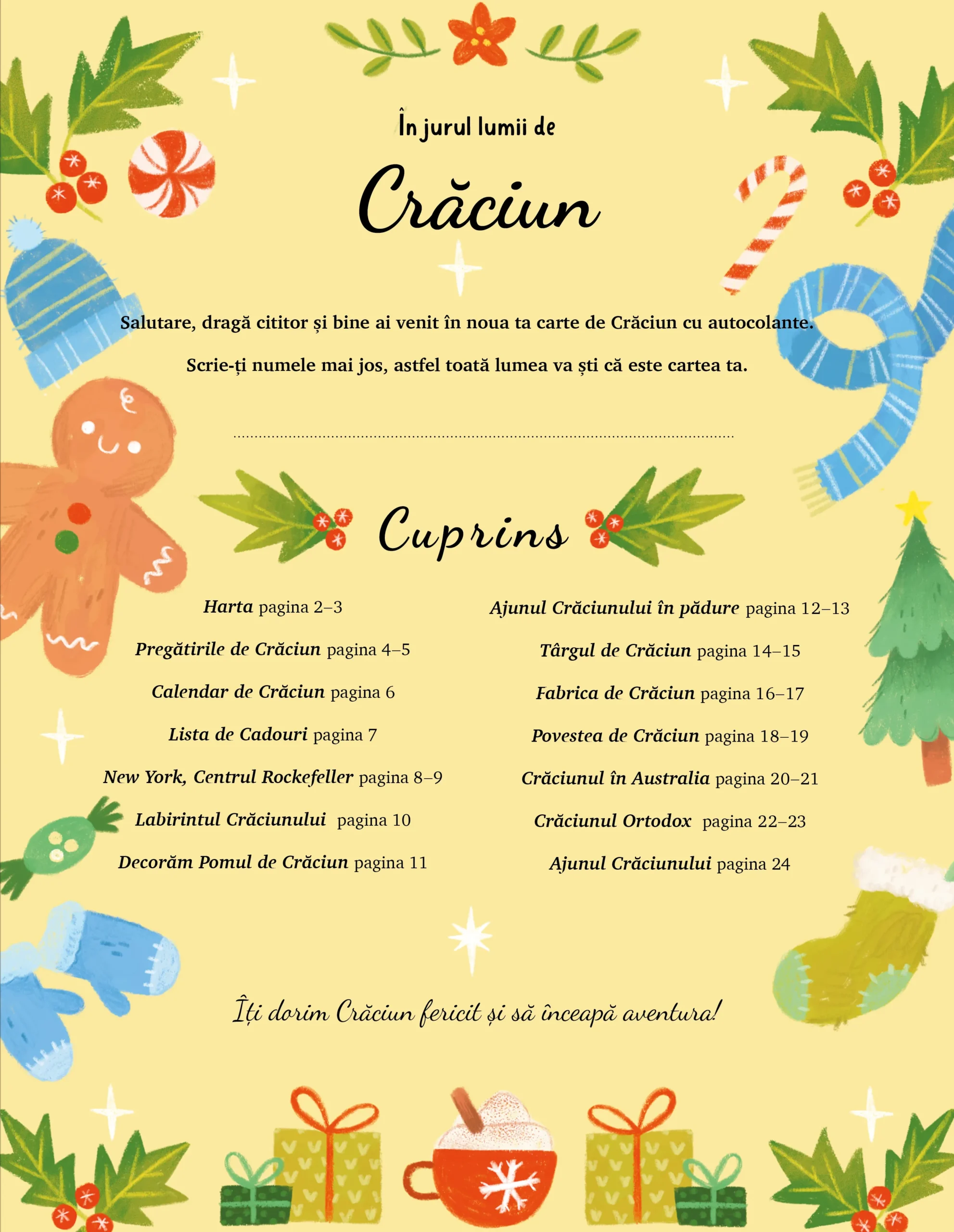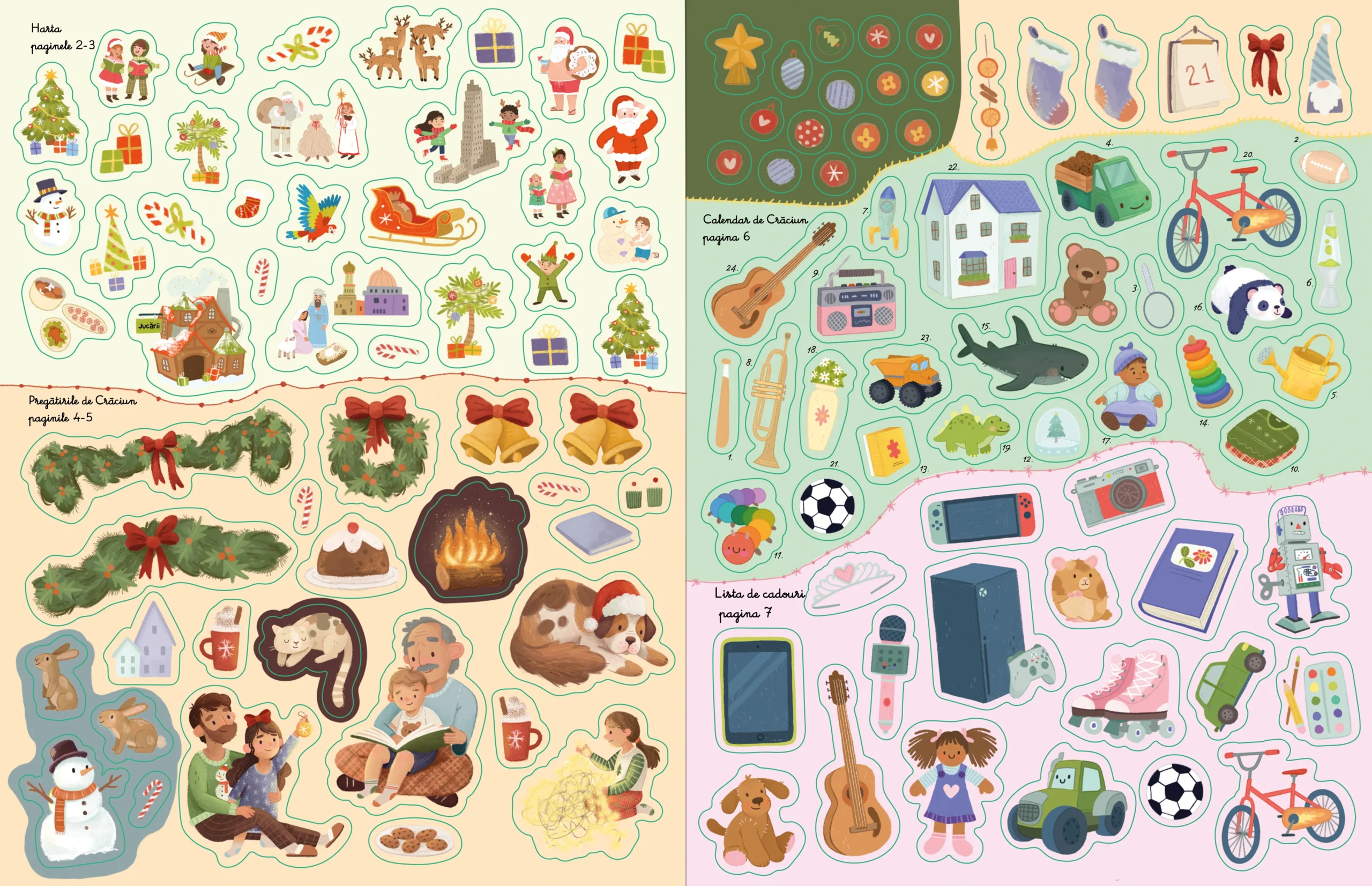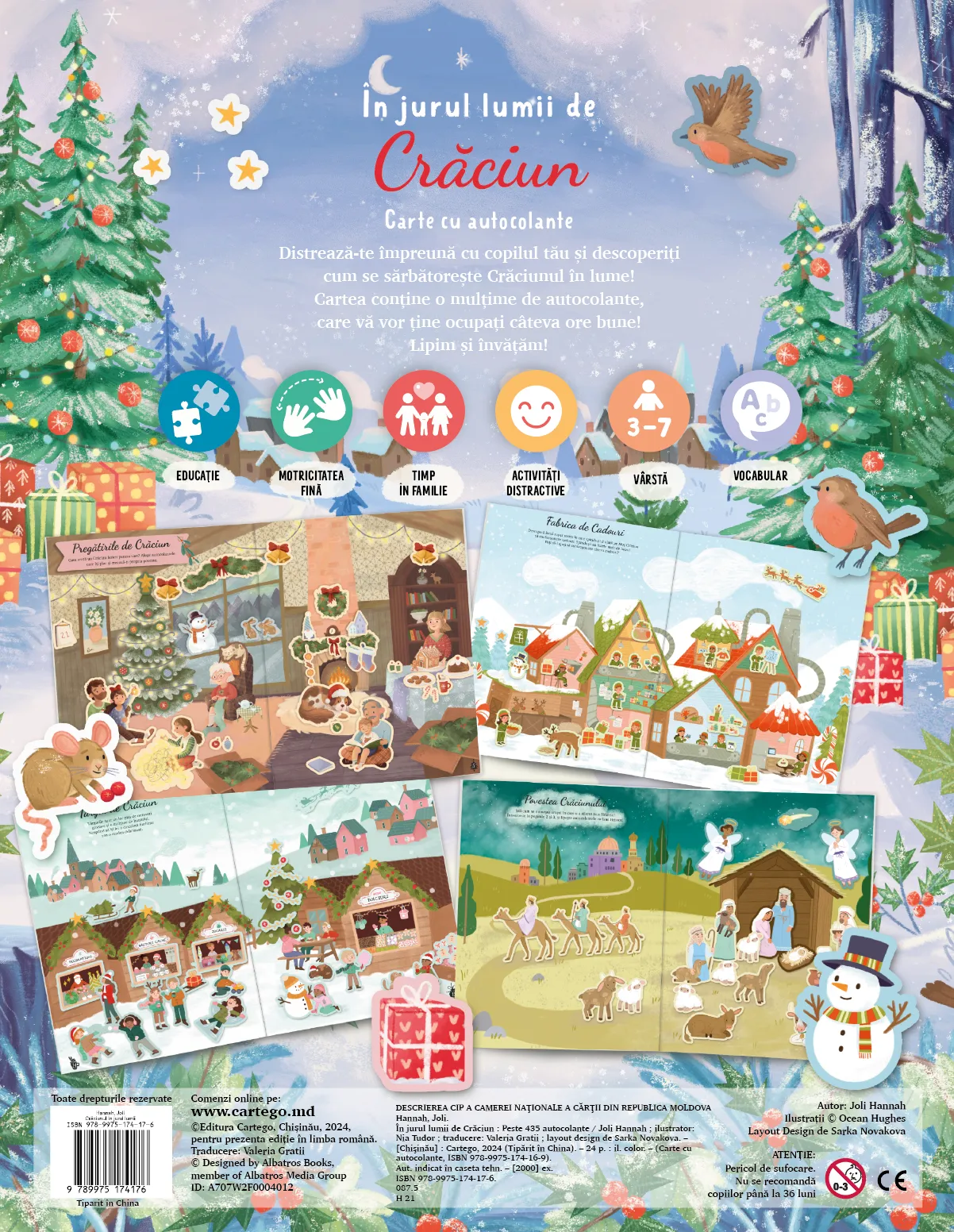 Cum se sărbătorește Crăciunul în Australia, dar în Statele Unite ale Americii? Această carte de activități cu autocolante este un mini Calendar de Crăciun, care îți povestește despre tradițiile din diverse părți ale lumii, în timp ce faci activități distractive.nCărțile care combină activități și autocolante captează atenția copiilor de 3-7 ani mai bine. Ilustrațiile colorate și cele peste 250 de autocolante îi ajută pe copii să-și dezvolte motricitatea fină și imaginația, creând diverse scene și istorii.