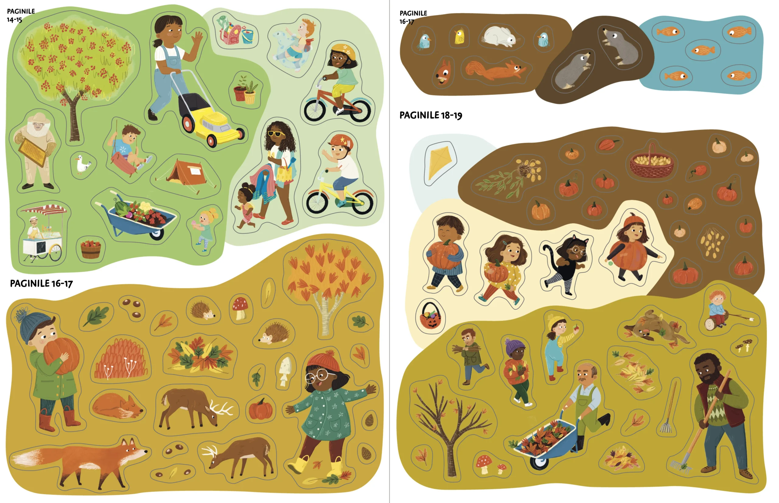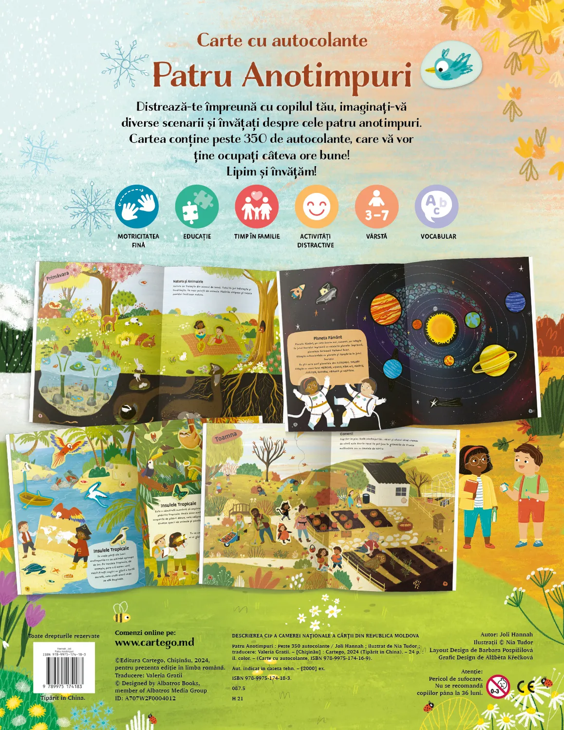 Această carte de activități a fost concepută pentru a familiariza copiii cu conceptele de bază despre cele patru anotimpuri, prin utilizarea unor ilustrații colorate și a peste 250 de autocolante. Cărțile îi ajută pe copii să învețe, prin joc, despre fenomenul de schimbare a anotimpului, sistemul solar, tipurile de vreme, noțiuni din geografie și nu doar, dezvoltând motricitatea fină și imaginația.