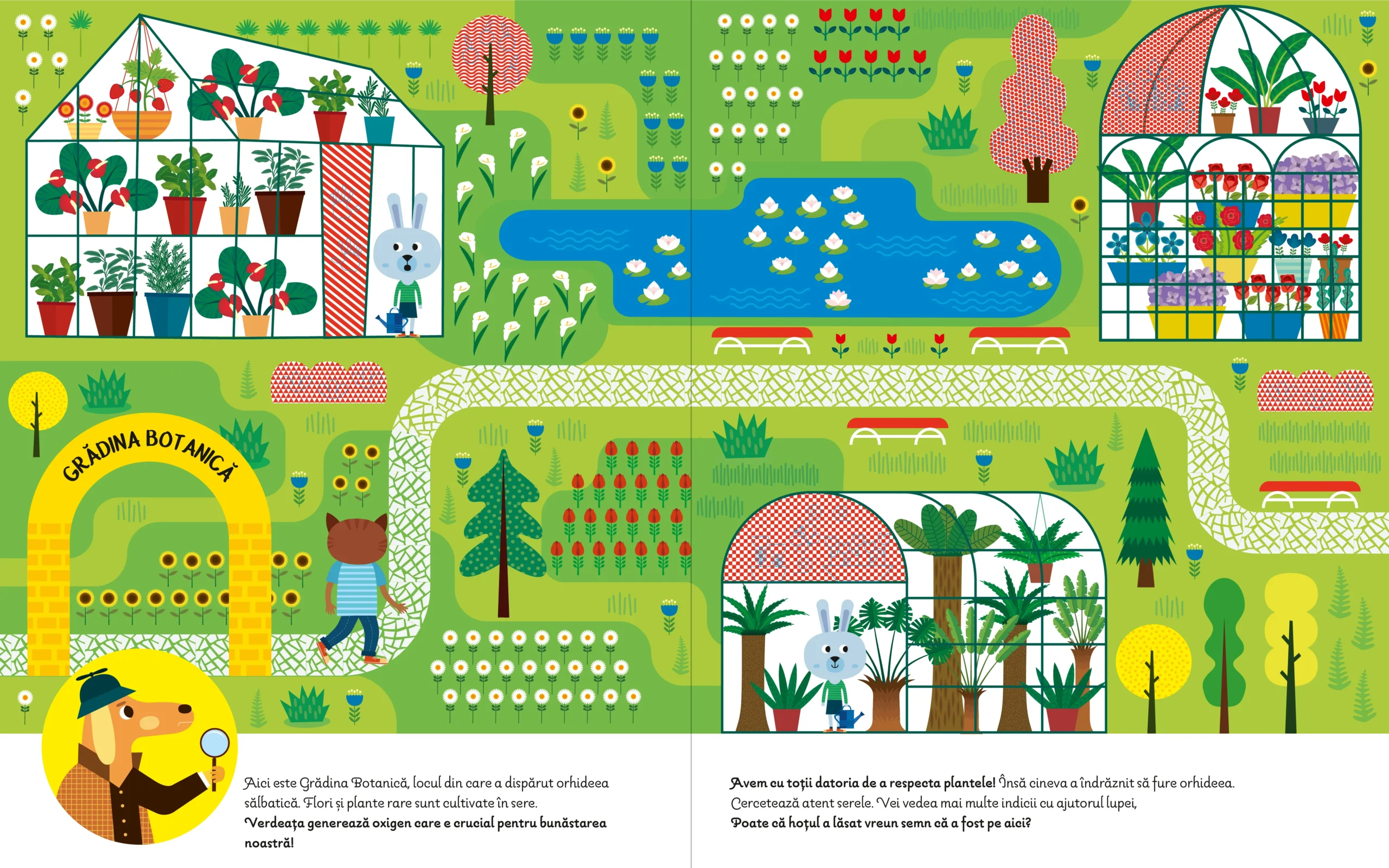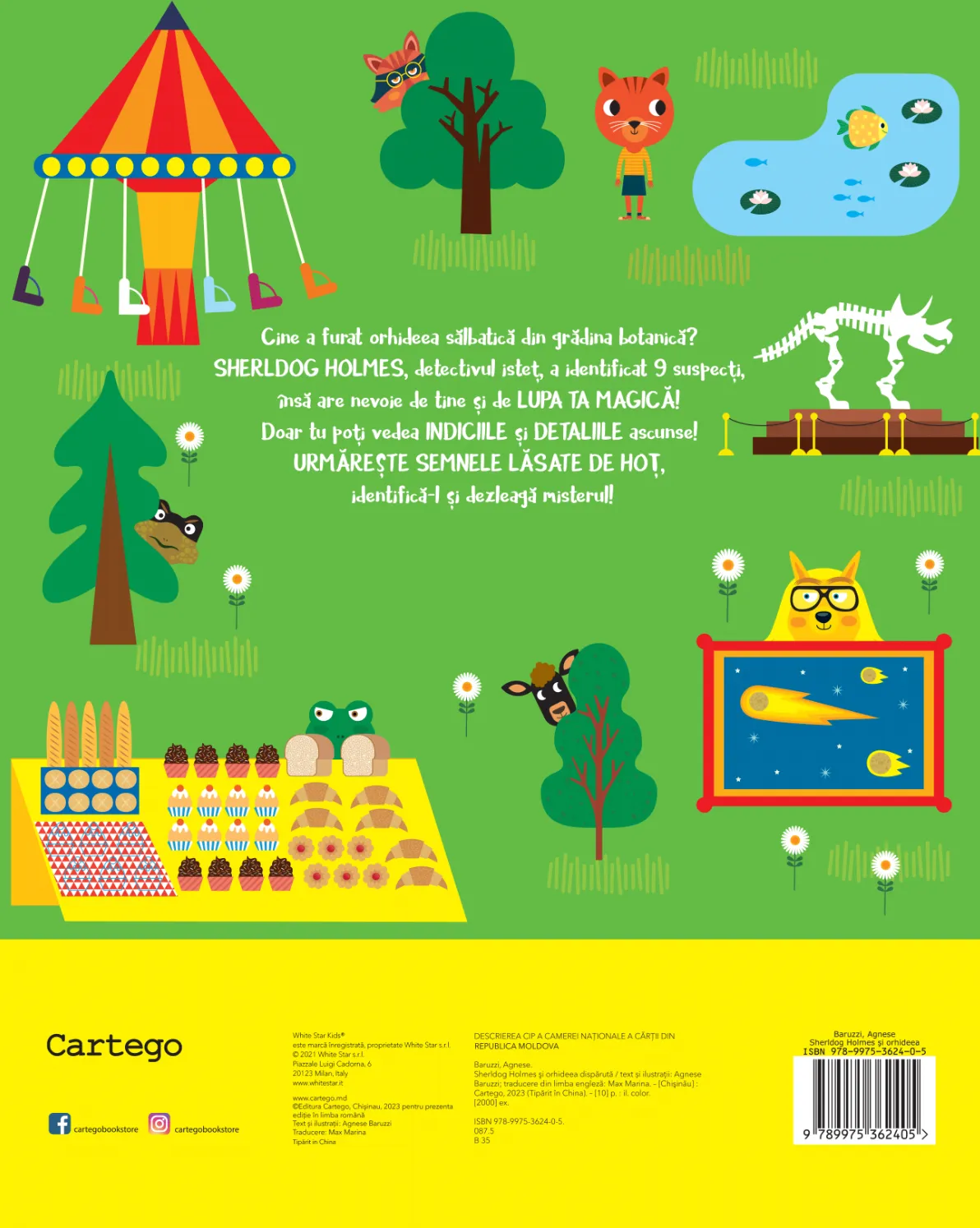 Cine a furat orhideea sălbatică din grădina botanică? Sherldog Holmes, detectivul isteț, a identificat 9 suspecți, însă are nevoie de tine și de lupa ta magică! Doar tu poți vedea indiciile și detaliile ascunse! urmărește semnele lăsate de hoț, identifică-l și dezleagă misterul!