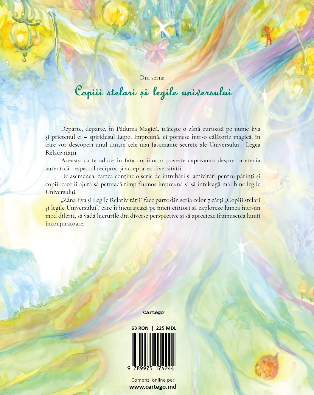 Departe, departe, în Pădurea Magică, trăiește o zână curioasă pe nume Eva și prietenul ei – spiridușul Lupo. Împreună, ei pornesc într-o călătorie magică, în care vor descoperi unul dintre cele mai fascinante secrete ale Universului – Legea Relativității. n nAceastă carte aduce în fața copiilor o poveste captivantă despre prietenia autentică, respectul reciproc și acceptarea diversității. n nDe asemenea, cartea conține o serie de întrebări și activități pentru părinți și copii, care îi ajută să petreacă timp frumos împreună și să înțeleagă mai bine legile Universului.n n„Zâna Eva și Legile Relativității” face parte din seria celor 7 cărți „Copiii stelari și legile Universului”, care îi încurajează pe micii cititori să exploreze lumea într-un mod diferit, să vadă lucrurile din diverse perspective și să aprecieze frumusețea lumii înconjurătoare.