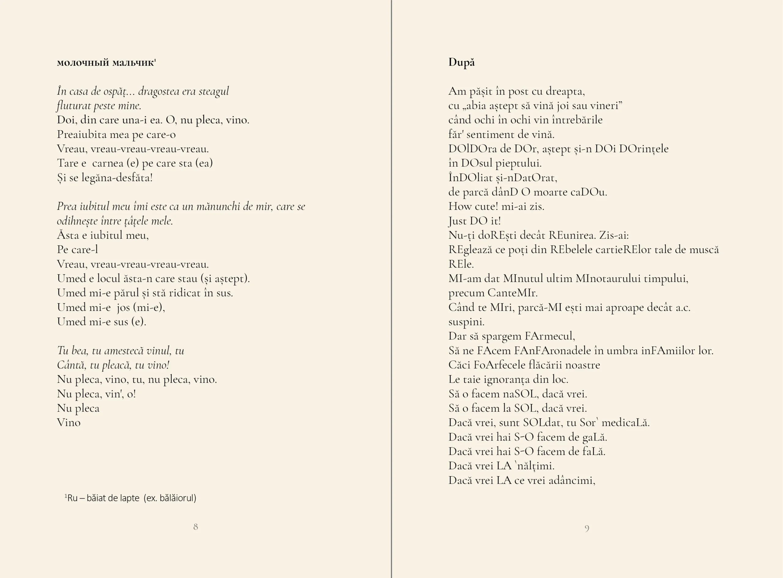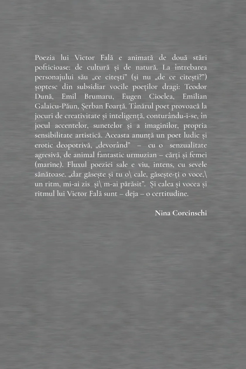 „Poezia lui Victor Fală e animată de două stări pofticioase: de cultură și de natură. La întrebarea personajului său „ce citești” (și nu „de ce citești?”) șoptesc din subsidiar vocile poeților dragi: Teodor Dună, Emil Brumaru, Eugen Cioclea, Emilian Galaicu-Păun, Șerban Foarță. Tânărul poet provoacă la jocuri de creativitate și inteligență, conturându-i-se, în jocul accentelor, sunetelor și a imaginilor, propria sensibilitate artistică. Aceasta anunță un poet ludic și erotic deopotrivă, „devorând” – cu o senzualitate agresivă, de animal fantastic urmuzian – cărți și femei (marine). Fluxul poeziei sale e viu, intens, cu sevele sănătoase. „dar găsește și tu o cale, găsește-ți o voce, un ritm, mi-ai zis și m-ai părăsit”. Și calea și vocea și ritmul lui Victor Fală sunt – deja – o certitudine.”nNina Corcinschi